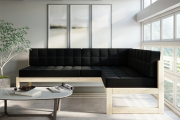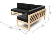 Каркас изделия выполнен из натурального и экологически чистого массива сосны. Чехол матраса не съемный, в комплекте три приспинные подушки. Основанием служит реечное дно из массива сосны. На диване могут расположиться четыре взрослых человека, вес каждого до 120 кг. Данная мебель предназначена для закрытых помещений или веранд с крышей, прямой солнечный свет и дождь ей противопоказаны.