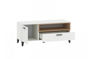 Тумба под ТВ с выдвижным ящиком на шариковых направляющих, с распашной дверцей и открытой полкой.